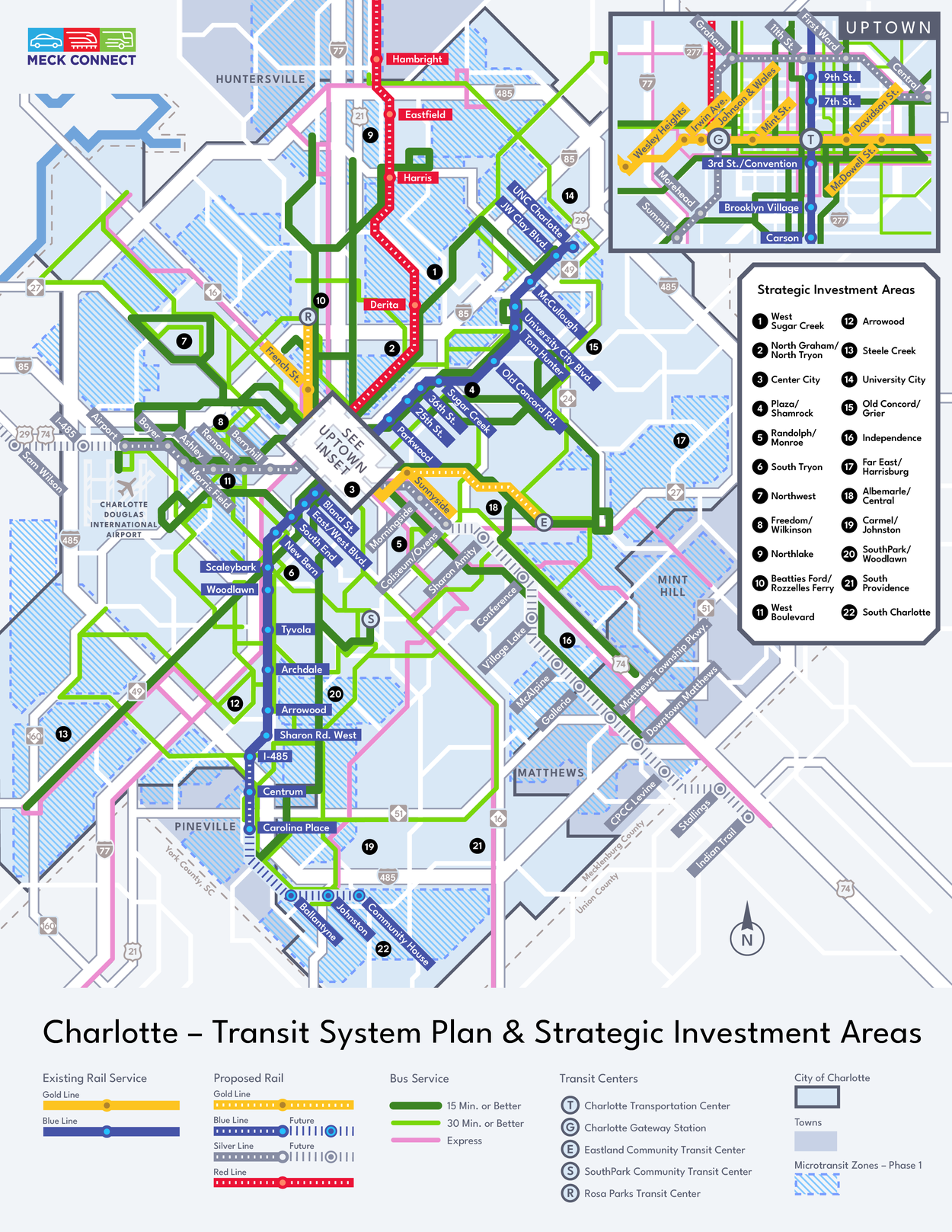 Meck Connect would make the community more accessible by providing more options to move more people. It would include strategic investment areas for road improvements and mobility upgrades, more frequent bus service, expanded rail, and new Microtransit zones connecting Charlotte to more neighborhoods and surrounding towns.