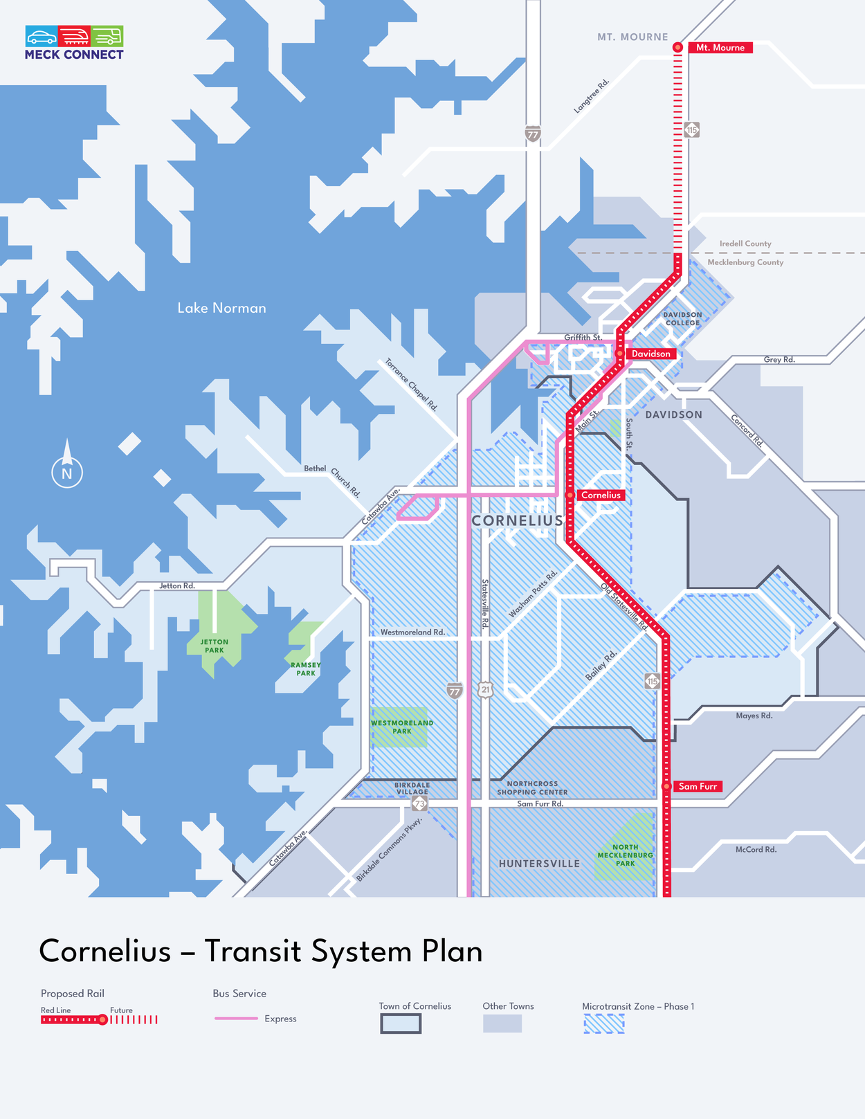 Meck Connect would make the community more accessible providing more options to move more people. It would include road improvements, more walkable neighborhoods, new transit connections including commuter rail, improved frequency on express bus, and expand curb-to-curb, on demand Microtransit.